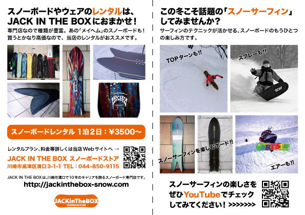神奈川県川崎市溝の口にあるスノーボード店。レンタルにも力を入れており、初心者から上級者まで幅広く支持されています。